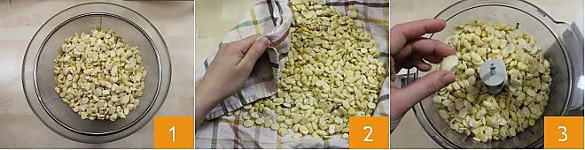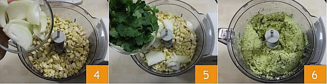 To prepare fava bean falafel, place the fava beans in a bowl with cold water and let them soak overnight. The next day, drain them in a colander 1 and dry them with a cloth 2. Place the beans in a mixer, add the garlic clove 3
