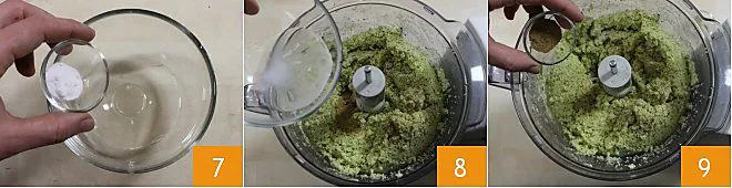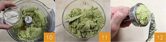 Finally, add the flour 10 and blend for a few more moments. You should get a mixture that is not too smooth but grainy 11. Heat the oil and bring it to a maximum temperature of 356°F (if you prefer, you can fry the falafel in a fryer). Baking is not recommended as, without breading, the falafel risk drying out. Use a teaspoon to scoop the mixture, pull back the lever on the special falafel tool (if you don't have the tool, you can form slightly flattened patties into disks); fill the cavity until a small dome is formed 12, pressing well with the teaspoon (each falafel weighs about 1 oz).