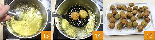 Release the lever and drop the falafel directly into the hot oil 13, turning the falafel occasionally and removing them when they are golden 14. Drain them on a sheet of absorbent paper 15 and salt them lightly, if you prefer. Serve your hot fava bean falafel!