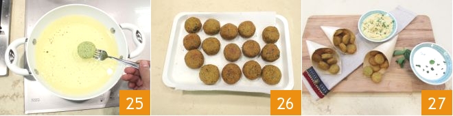 Put the seed oil in a large pot and bring it to the ideal temperature between 330°F and 356°F (for safety, you can use a kitchen thermometer to measure the temperature). Gently immerse the falafel 25 and fry them, a few at a time, for about 1 minute, turning them often to brown them evenly. Drain the falafel on absorbent paper to dry them from excess oil 26 and enjoy them hot, accompanied by hummus and yogurt sauce 27.