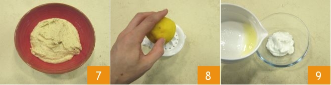 Blend until you get a thick and homogeneous cream, then transfer it to a small bowl 7. Your quick hummus is ready; now you can focus on the yogurt sauce. Squeeze the lemon 8, collect the juice and add it to the yogurt in a small bowl 9. Also, add the coarsely chopped mint.