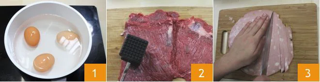 To prepare the falsomagro, start by hard-boiling the eggs in a pot full of water 1, then take the slice of beef and pound it well with a meat mallet, to ensure even thickness 2. Slice the mortadella 3,