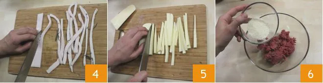 the lard 4 and the caciocavallo 5 into strips about 1/4 inch thick, then set everything aside. In a large bowl, combine the ground meat, the grated cheese 6