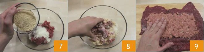 and the breadcrumbs 7, then mix well with your hands 8. Adjust with salt and pepper, then place the mixture on the beef slice 9, making sure to spread it well and leave about 3/4 inch of border on each side to prevent the filling from spilling out when rolling the meat.