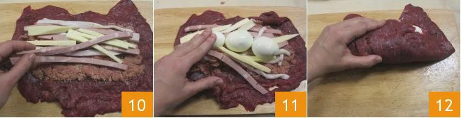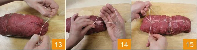 Close the falsomagro by rolling the meat onto itself; to seal it, use kitchen twine, as shown in the figures (13-14-15) (for more details on how to tie a roast click here).