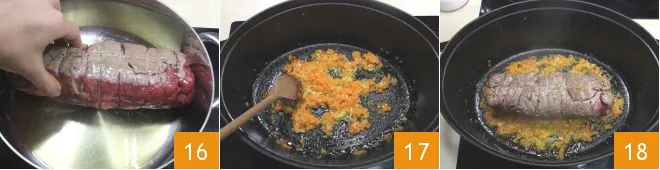 Brown the meat in a pan with a little oil 16, making sure to sear it well on all sides. Meanwhile, prepare a mixture of celery, onion, and carrot, and sauté it in a non-stick pan with two tablespoons of extra virgin olive oil, for a few minutes over low heat 17. Once the falsomagro is browned, add it to the sauté 18, continuing to cook over medium heat;
