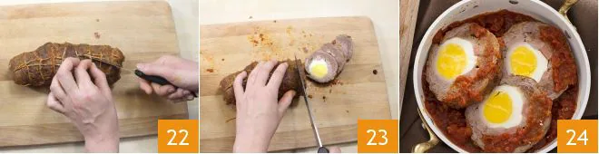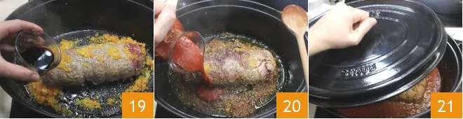 after a couple of minutes, deglaze with the red wine 19. Then add the tomato sauce 20, a tablespoon of triple-concentrated tomato paste, salt, and pepper. Cover with a lid 21 and let the falsomagro cook over low heat for 60 minutes, occasionally turning it for even cooking. After this time, check that the falsomagro is done by piercing it with a fork: the meat should be tender.