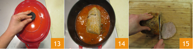 Cover with the lid 13 and continue cooking for 90 minutes. At this point, the meat will be ready 14, remove it from the pot and slice it once it has cooled 15.