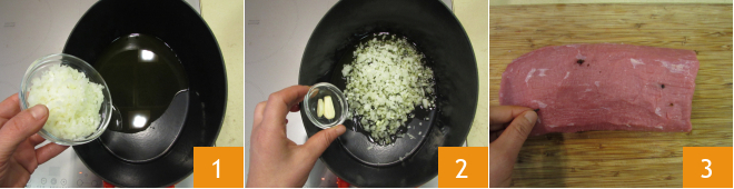 To prepare the Fano-style pot roast, first chop the onion and place it in a large pan with the oil 1 and the whole peeled garlic 2. Let it sauté over moderate heat for a few minutes so that the onion becomes tender. Meanwhile, take the meat and stud it with the cloves 3.