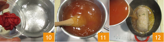 Meanwhile, heat the water and dissolve the concentrate in it 10, stir to blend, then pour it directly into the pan with the meat 12.