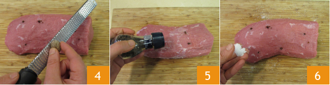 Season with grated nutmeg 4, pepper 5, and salt 6.