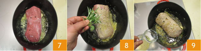 Place the meat in the pan and sear it on all sides, then flavor with the herbs 8 and deglaze with the wine 9 and let it evaporate.
