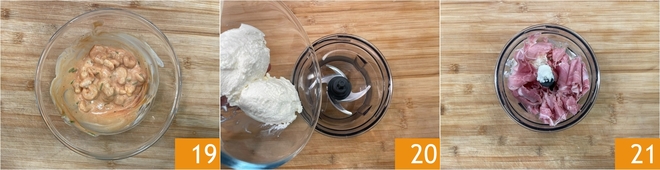 Mix well and this filling is ready too 19. To prepare the last filling, add ricotta cheese 20 and cooked ham 21 to the mixer.