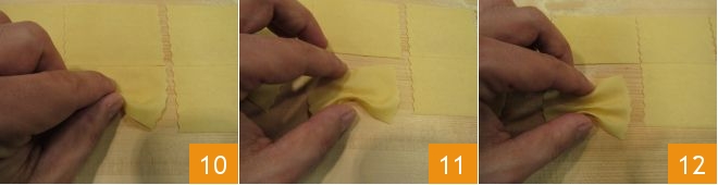 On the sheets you will get, pass a pasta cutter to make rectangles, like this: create vertical strips 3 inches wide with the scalloped side 7, then cut horizontally with the smooth side, to form sides of 1.5 inches 8. To form the farfalle, you'll need to use your thumb and index finger: with your thumb, lift one edge of the dough at the center of the rectangle 9