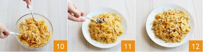 Mix well to blend everything together 10, then garnish each plate with the coarsely chopped walnut kernels 11: your farfalle with carrot pesto is ready to be enjoyed 12!
