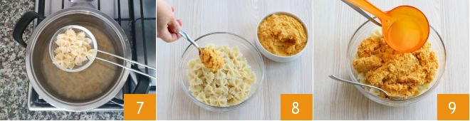 When the water comes to a boil, add the farfalle and cook them al dente 7. Drain the pasta, keeping some of the cooking water aside, and transfer it to a bowl, then add the carrot pesto 8 and mix carefully. Pour a ladle of the reserved cooking water to make the sauce even creamier 9.