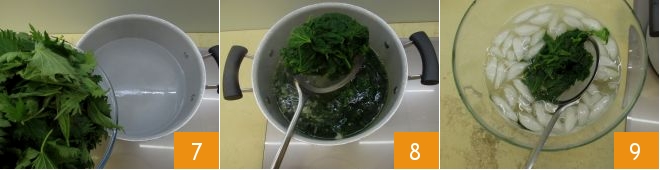 and place them in a pot with lightly salted boiling water 7; cook for 10 minutes, then drain the nettles, being careful to keep the cooking water in the pot as you'll need it later 8, and place them in a container with ice water so they cool quickly without losing their brightness 9;