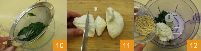 Once they are cold, you can squeeze them in a fine-mesh sieve, pressing with a fork, to remove the excess water 10. Meanwhile, take the burrata, remove the string around the "onion", chop it roughly 11, and toss it into the cup of a blender along with the well-squeezed nettles and pine nuts 12.