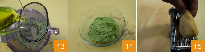 Blend everything for a few moments, then start pouring in the oil in a thin stream while running the blender 13. Let the blades run until you get a creamy and homogeneous mixture, salt and pepper to taste, and transfer it to a small bowl 14. Take the fresh pasta, divide the dough into quarters (keep the rest wrapped in plastic wrap while waiting to work it), then pass the first piece through the roller of the pasta machine 15,