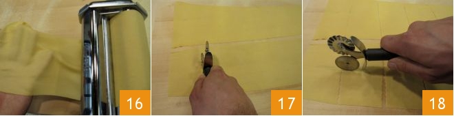 rolling several times from the largest thickness to the second to last to obtain a very thin sheet, about 1/25 inch thick 16. On the obtained sheets, pass the pastry wheel to create rectangles: make vertical lines with the fluted wheel spaced 2¾ inches apart 17. Then, with the smooth wheel, cut horizontally every 1½ inches 18 to obtain smaller rectangles.