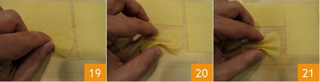 To form the farfalle from fresh pasta, use your thumb and index finger: position your thumb at the center of the bottom edge of the rectangle and your index finger at the center of the rectangle; with your thumb, push the pasta edge towards the center (19-20); then with your index finger, bring the top edge towards the center as well 21: you will have created three folds in two moves.