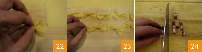 Pinch in the center to define the butterfly shape and continue this way for all the rectangles 23 and finish the fresh pasta. As you make the farfalle, you can place them on a slightly floured tray (use semolina flour if you prefer so it doesn't get absorbed by the fresh pasta). Finally, prepare the seasoning: cut the smoked bacon into strips 34, then dice it