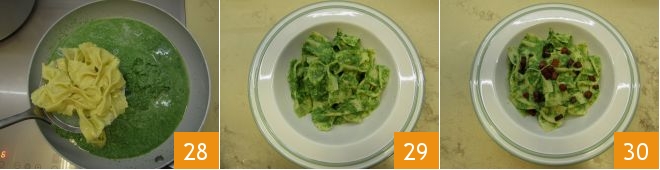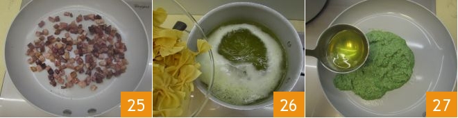 and sauté in a pan for 2-3 minutes over medium heat, just enough to make them golden and crispy 25. Cook the farfalle in the same nettle cooking water brought to a boil 26; it will take about 5 minutes. In another pan, with the heat off, pour the nettle pesto, dilute with 1 ladle of the pasta cooking water to thin it 26;