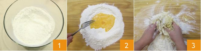 To make farfalle with nettle pesto, start with the fresh pasta: weigh the flour 1 and then pour it onto the work surface (you can use a bit less flour, start with 160-180 g and add more as needed if the dough seems too soft), then add the eggs and mix everything first with a fork 2 then continue by hand 3; keep working until you get a smooth and elastic dough.