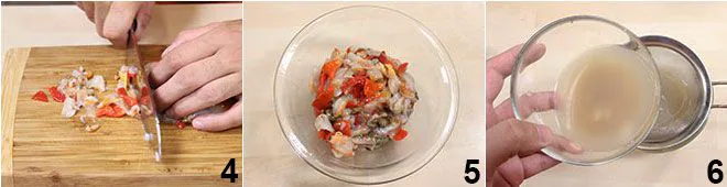 On a cutting board with a knife, roughly chop the fasolari and keep them in a bowl (4-5). Strain the collected juice 6 and set everything aside.