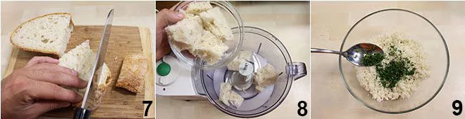 Now focus on the filling: remove the crust from the bread and cut the crumb into pieces 7. Place the crumb in a mixer and chop it, then mix it with the chopped parsley 9.