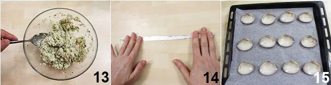 until you obtain a creamy mixture 13. Create strips with aluminum foil, fold them into circles, and place them under each fasolari shell 14 to support them upright. Place the shells on a baking sheet covered with parchment paper 15.
