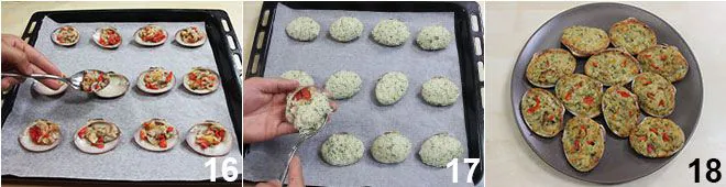 Now add a tablespoon of chopped fasolari to each shell 16 and cover each with a tablespoon of the bread mixture 17. Bake at 392°F for 25 minutes, then after this time, increase the temperature to the maximum and turn on the grill for 5 minutes until a golden crust forms on the surface 18. The gratinated fasolari will be ready to be served!