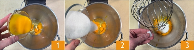 To prepare the Father's Day cake, start with the sponge cake: pour the eggs, yolks 1, sugar 2, and a pinch of salt 3 into the bowl of a stand mixer fitted with whisks.