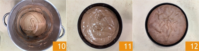 The batter is ready 10, so pour it into a greased and floured 10-inch diameter pan 11. Level the surface with the back of a spoon and bake the sponge cake in a preheated static oven at 350°F for 30-35 minutes. Before removing from the oven, check for doneness with a toothpick. Let it cool completely in the pan 12.