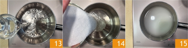 Focus on preparing the syrup: pour the water 13 and sugar 14 into a saucepan, then heat over moderate heat 15.