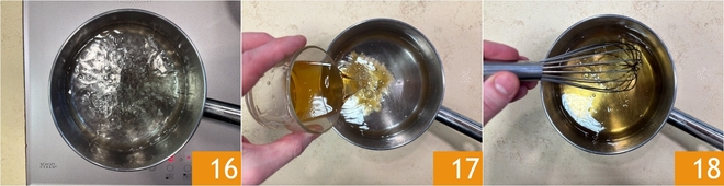 As soon as the mixture reaches a boil 16, remove it from the stove. Allow the mixture to cool, then add the rum 17, stir with a whisk, and set aside 18.