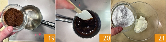 Prepare the cream: in a saucepan, pour water and instant coffee 19, heat the mixture on the stove, and stir until the coffee is completely dissolved without lumps 20. In a bowl, combine the mascarpone and powdered sugar 21.