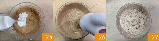 Finally, incorporate the liquid cream 25 and whip 26 until you achieve a dense and compact consistency, yet smooth and creamy 27.