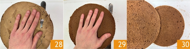When the sponge cake is cool, remove the top crust with a serrated knife 28. Make a horizontal cut in the center of the sponge cake 29 to create two equal halves ready to be filled 30.