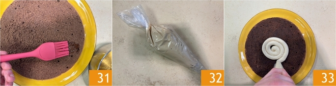 Place the first sponge cake disc on the serving plate and lightly soak it with the rum syrup using a brush 31. Transfer the cream to a piping bag 32 and distribute it over the first sponge cake disc 33.