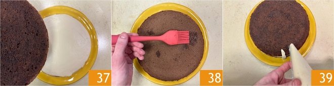 Level the cream with a spatula 34 to achieve a smooth surface 35. With the brush, moisten the inner part of the second sponge cake disc 36.