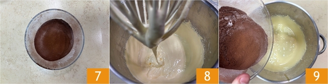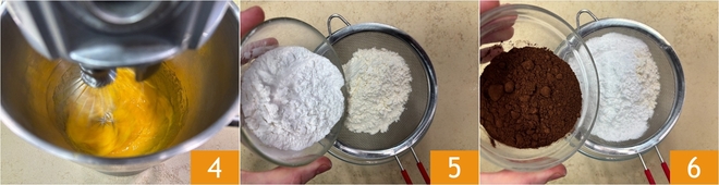 Whip the mixture for about 10 minutes at maximum speed 4 until it becomes very frothy. Meanwhile, sift the flour, starch 5, and cocoa 6 into a bowl.