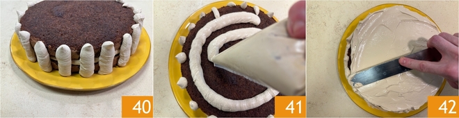 Spread more cream over the top 41, then smooth the entire cake with a spatula 42.