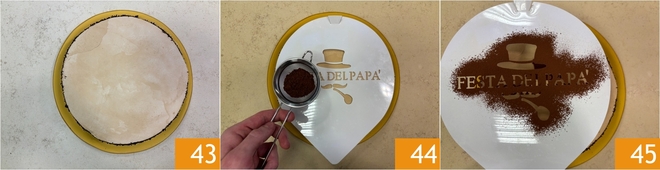 You need to achieve a perfectly smooth surface 43. Adhere cocoa sprinkles to the edge of the cake. Leave the cake in the freezer for 20-30 minutes so that the cream on the surface hardens, but the center of the cake does not start to freeze. After the rest in the freezer, place the stencil on the surface of the cake 44 and dust with cocoa using a sifter 45. Carefully remove the stencil, making sure not to drop cocoa onto the cake. Clean the edge of the plate of any cocoa residue with a paper towel.