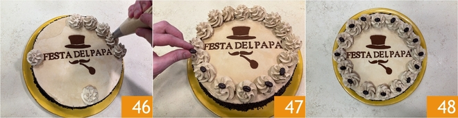 Transfer the remaining coffee cream to a piping bag with a star tip and pipe rosettes all along the edge 46. Place a chocolate coffee bean on top of each cream tuft 47. Let the Father's Day cake rest in the refrigerator for at least 2-3 hours before serving 48.