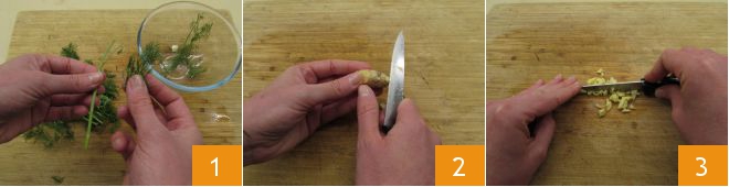 To prepare the fennel and ginger pesto, start by cleaning the fennel. If you notice any rotten or yellowed leaves, remove them; if you see any soil, just remove it with a damp cloth. Then detach the leaves from the stems and collect them in a bowl 1. Next, move on to the ginger, peel it with a smooth knife 2, and chop it coarsely; this will make it easier to work in the mortar 3.