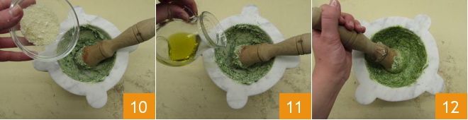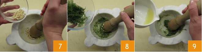 Gradually add the pine nuts, preferably a little at a time 7, then continue by adding the fennel leaves 8 and then the lemon juice 9.