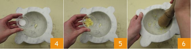 If you don’t have a very large mortar, divide the preparation and do it in two batches. Add the peeled garlic with the core removed, the coarse salt 4, and the ginger 5. Start crushing everything using the pestle 6.