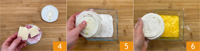 Add a layer of cheese 4 and close with another slice of fennel. Dip the whole thing first in flour 5 and then in eggs beaten with milk 6.