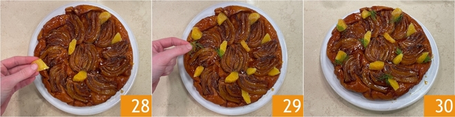 Garnish the surface with the orange segments 28 and a few fennel fronds 29. Your fennel tatin is ready to be served 30!